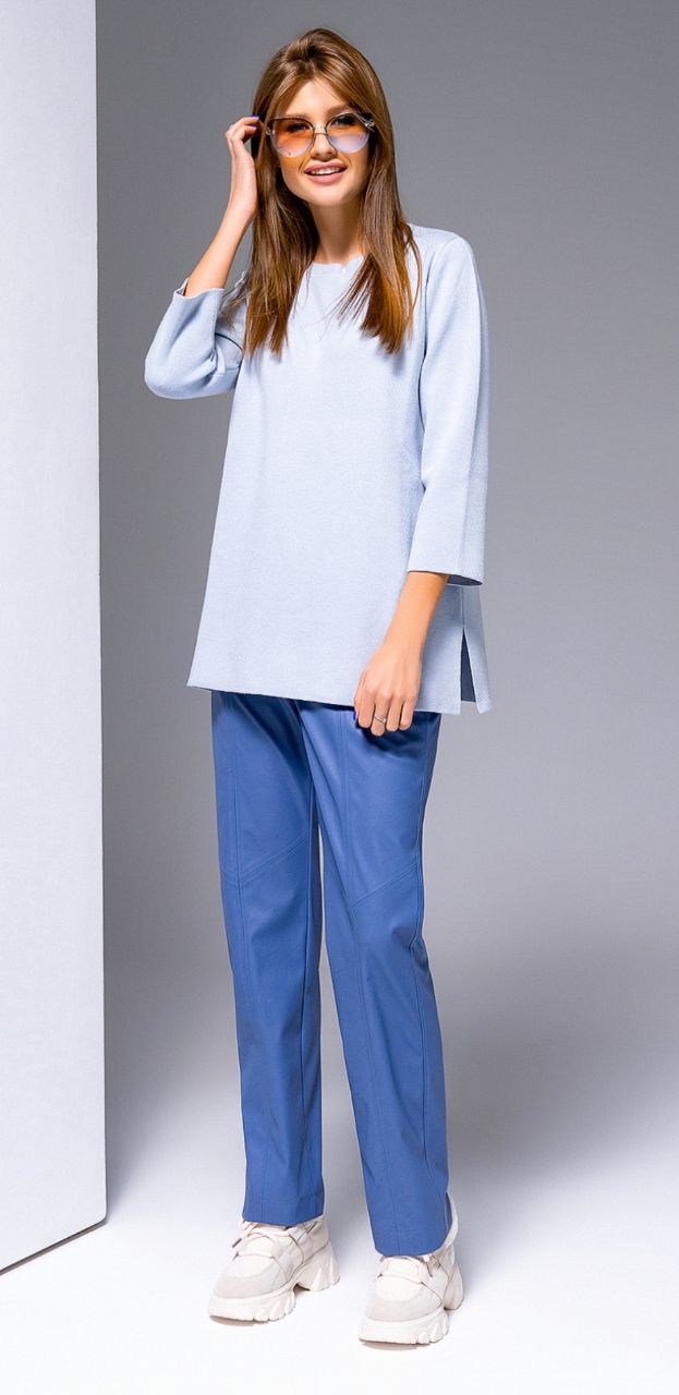 Джемпер-туника нежно-голубого цвета, рукав 3/4, по бокам джемпера небольшие разрезы. Джемпер тактильно очень приятный.