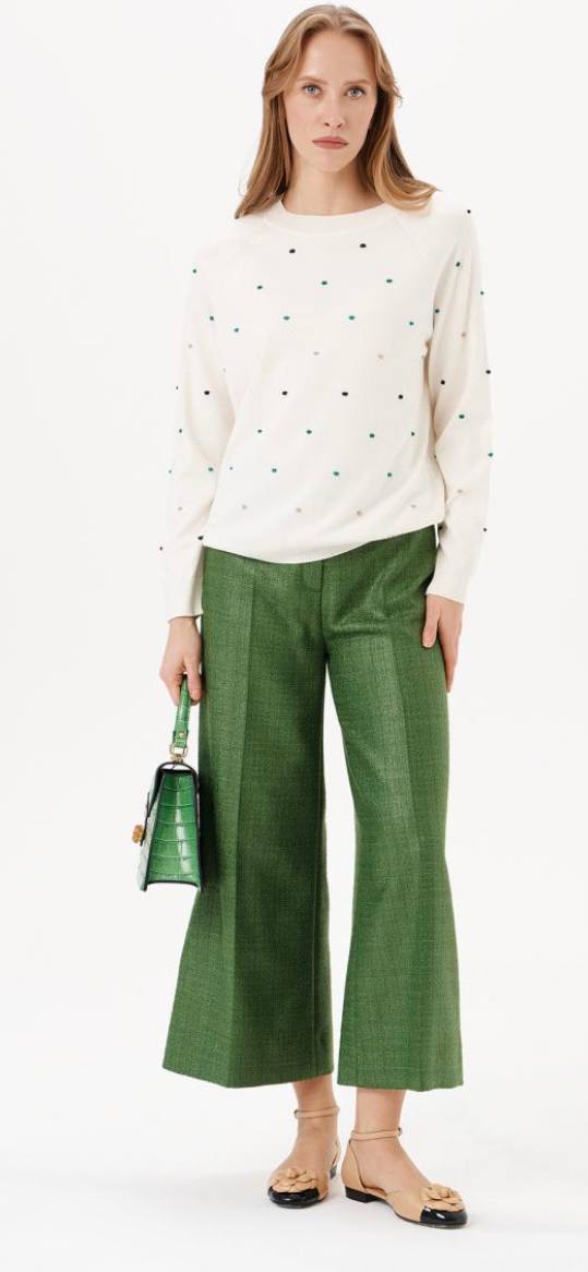 Женский джемпер приятного сливочного оттенка прекрасно будет сочетаться с низом любого цвета.