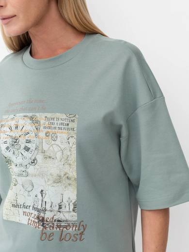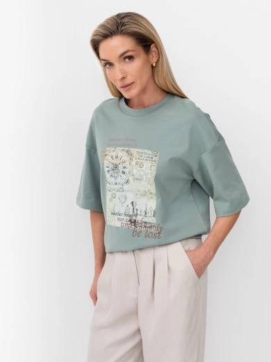 Хлопковая футболка в приятном мятном оттенке с красивым принтом.Надписи выполнены в эффектном золотом и коричневом напылении, так же добавлена вышивка внизу принта.