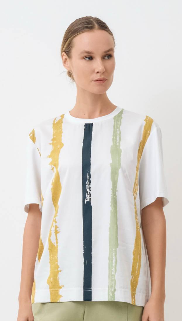 Футболка прямого кроя с разным сочетанием фактуры тканей. Перед выполнен из ткани 100% хлопка. Спинка и рукава выполнены из трикотажа 100% хлопок.