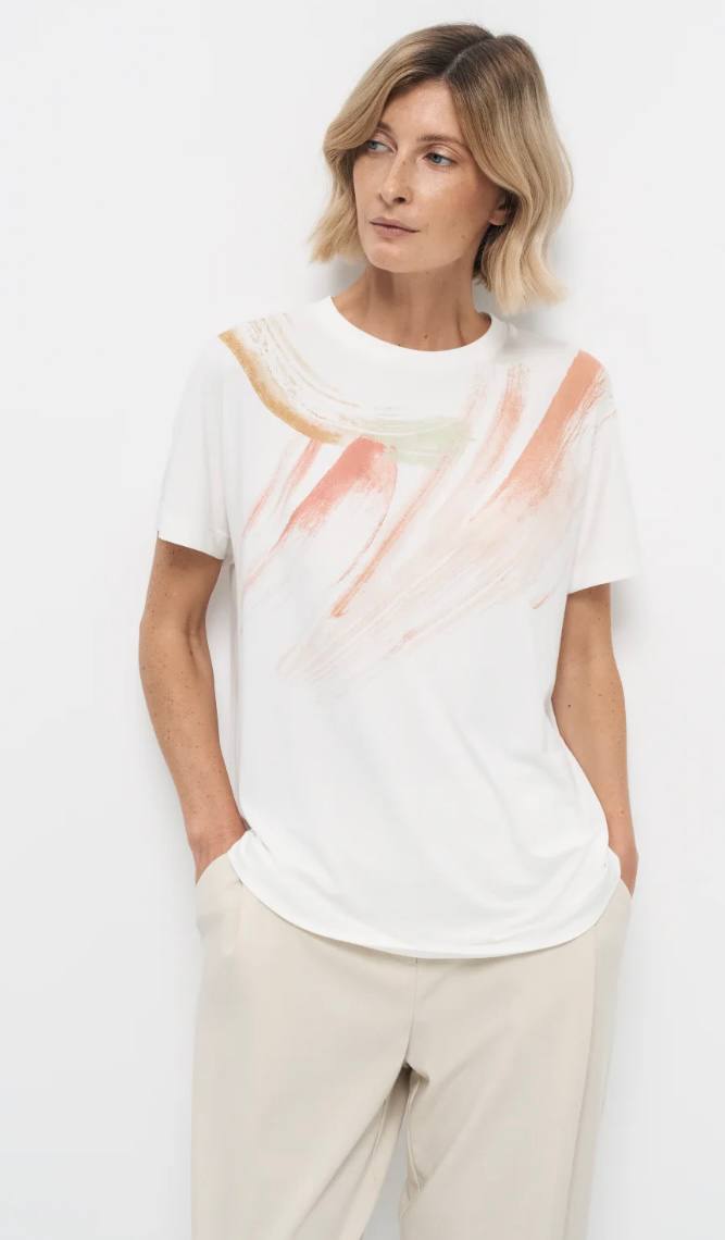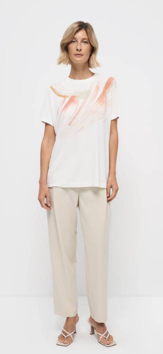 Футболка с рисунком в нежных тонах выполнена из шелковистого трикотажного полотна, создает эффект прохлады. Натуральный состав ткани очень тактильно приятный.