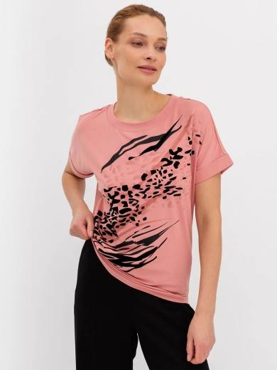 Футболка дополнена эффектным рисунком с элементом нанесения бархатной фактуры в черном цвете.