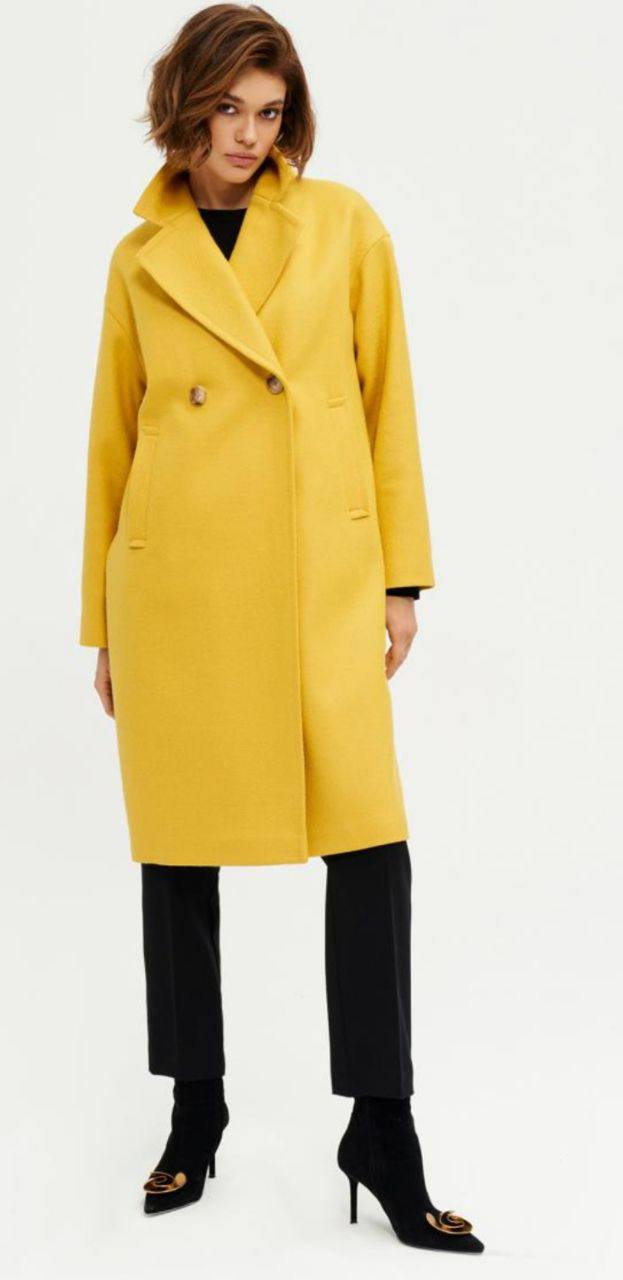 Легкое пальто за подкладке в красивом желтом цвете. Застежка на одну пуговицу, двубортное. Такая длина пальто красиво сочетается с брюками, юбками и платьем.