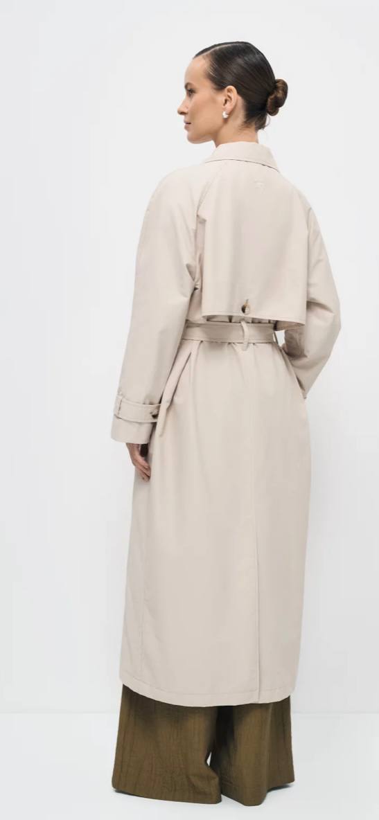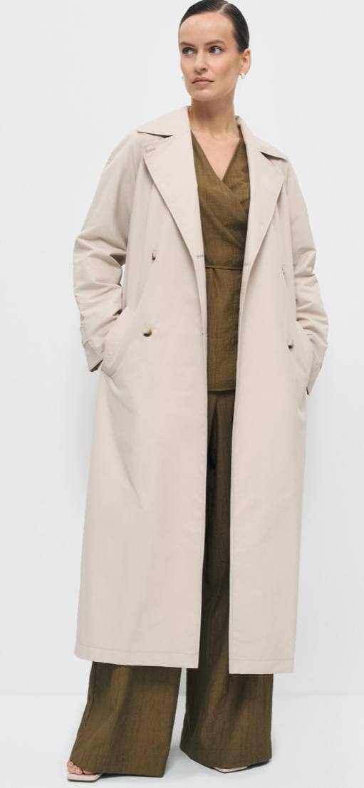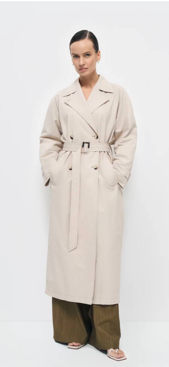 Стильный плащ - тренч, длины макси. Двубортная застежка, рукав реглан хорошо садится на любую фигуру. По спинке отлетная кокетка, фиксируется на пуговицу. В комплекте имеется пояс. Плащ на подкладке.