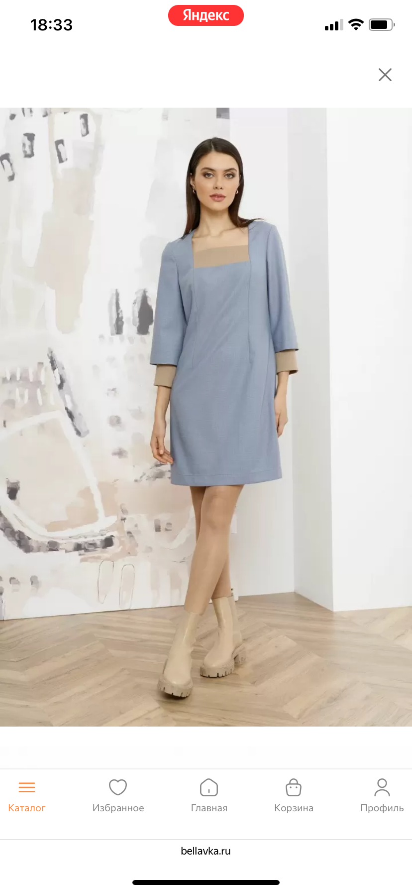 Платье длиной выше колена, слегка приталенное, на подкладке. Рукав 3/4. Впереди по вырезу есть трикотажная вставка, так же и по рукаву.