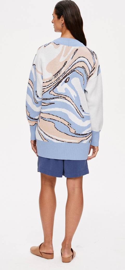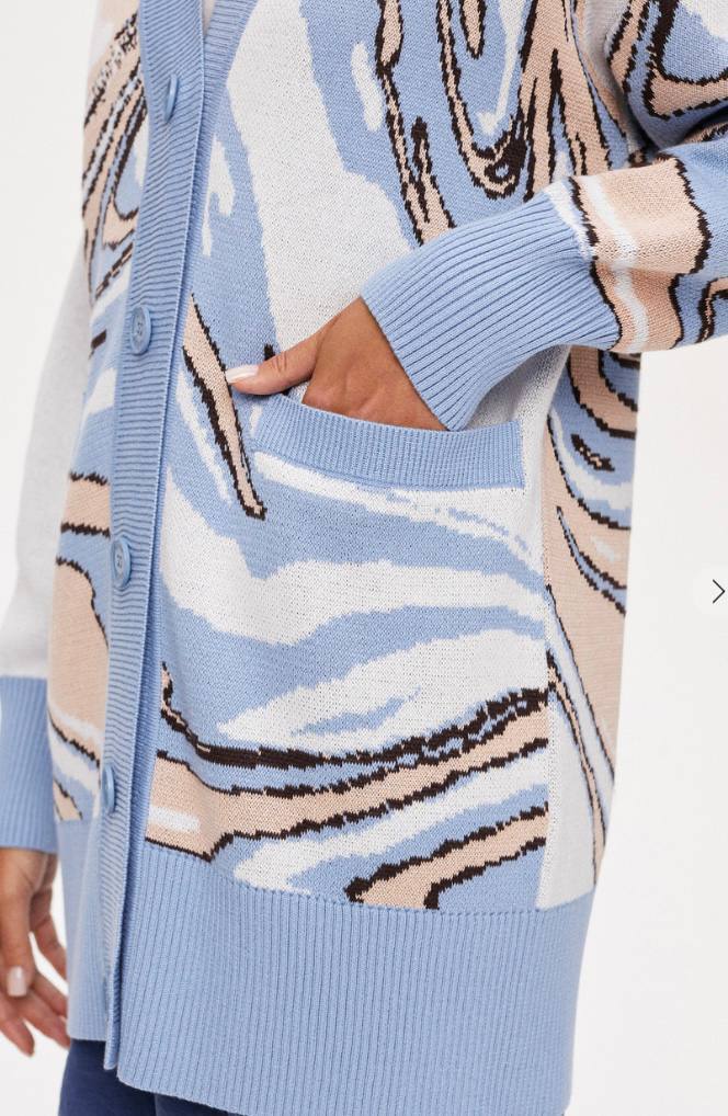 Жакет удлиненный вязаный, на пуговицах. Есть карманы.